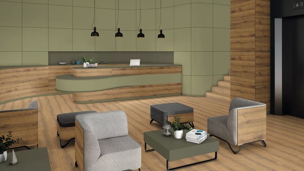 Зеленый – цвет природы, поэтому он как нельзя лучше символизирует экологичность. Помещения в так называемом биофильном дизайне часто оформляют с использованием множества приглушенных оттенков зеленого цвета, которые в сочетании с натуральными материалами отражают разнообразие природы. Декор U640 Зелёный оливковый представляет собой желтовато-зеленый, то есть более теплый вариант серовато-зеленых оттенков, которые не теряют своей актуальности и могут использоваться во многих комбинациях. В сочетании с древесными репродукциями от средне-светлых до темно-коричневых натуральных оттенков этот зеленый декор смотрится очень естественно и элегантно; комбинации со светлыми древесными декорами привносят в интерьер природную свежесть. Этот декор с лакированной матовой поверхностью TM9 PerfectSense Мягкий матовый визуально и на ощупь кажется бархатистым, а на самой поверхности при прикосновении не остается следов от пальцев.