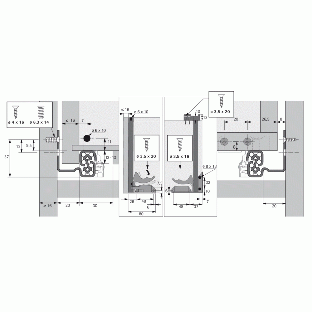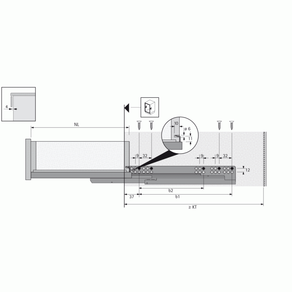 При использовании фиксаторов/деталей крепления для выдвижных полок длину полки необходимо уменьшить на 12 мм (номинальная длина NL - 12 мм)