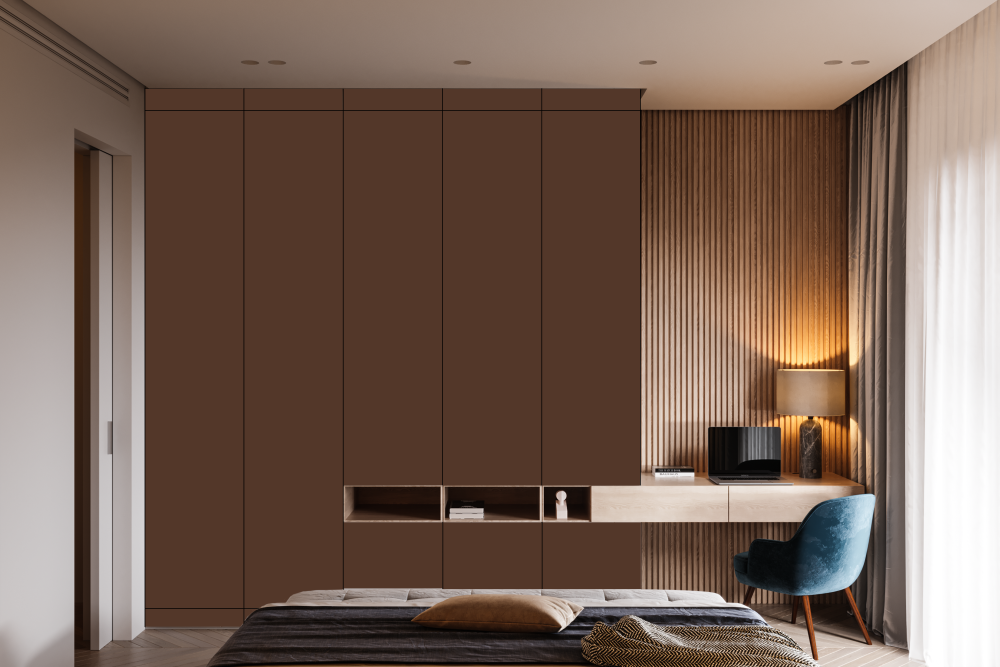 Тёмно-коричневый – насыщенный коричневый, напоминающий цвет шоколада и поэтому часто встречающийся в бистро и кафе в сочетании с более светлыми естественными древесными декорами. Структура ST9 Мягкий матовый придает всей палитре однотонных декоров естественно матовую поверхность, сопоставимую на ощупь с лакированной.