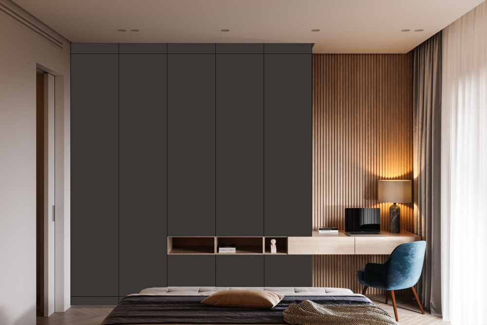 Нежный чёрный – очень темный, почти черный декор серого цвета с теплым коричневым отливом из категории модных оттенков «Nearly Black» (почти черный). При сочетании этого декора с темно-коричневыми древесными репродукциями, например Орехом, можно создавать очень элегантный контраст, поэтому он часто применяется в производстве мебели для жилых помещений. Декор представляет собой альтернативный вариант резким контрастам, образуемым декором Чёрный. Структура ST9 Мягкий матовый создает на поверхности всех однотонных декоров естественное матовое покрытие с бархатистым тактильным эффектом.