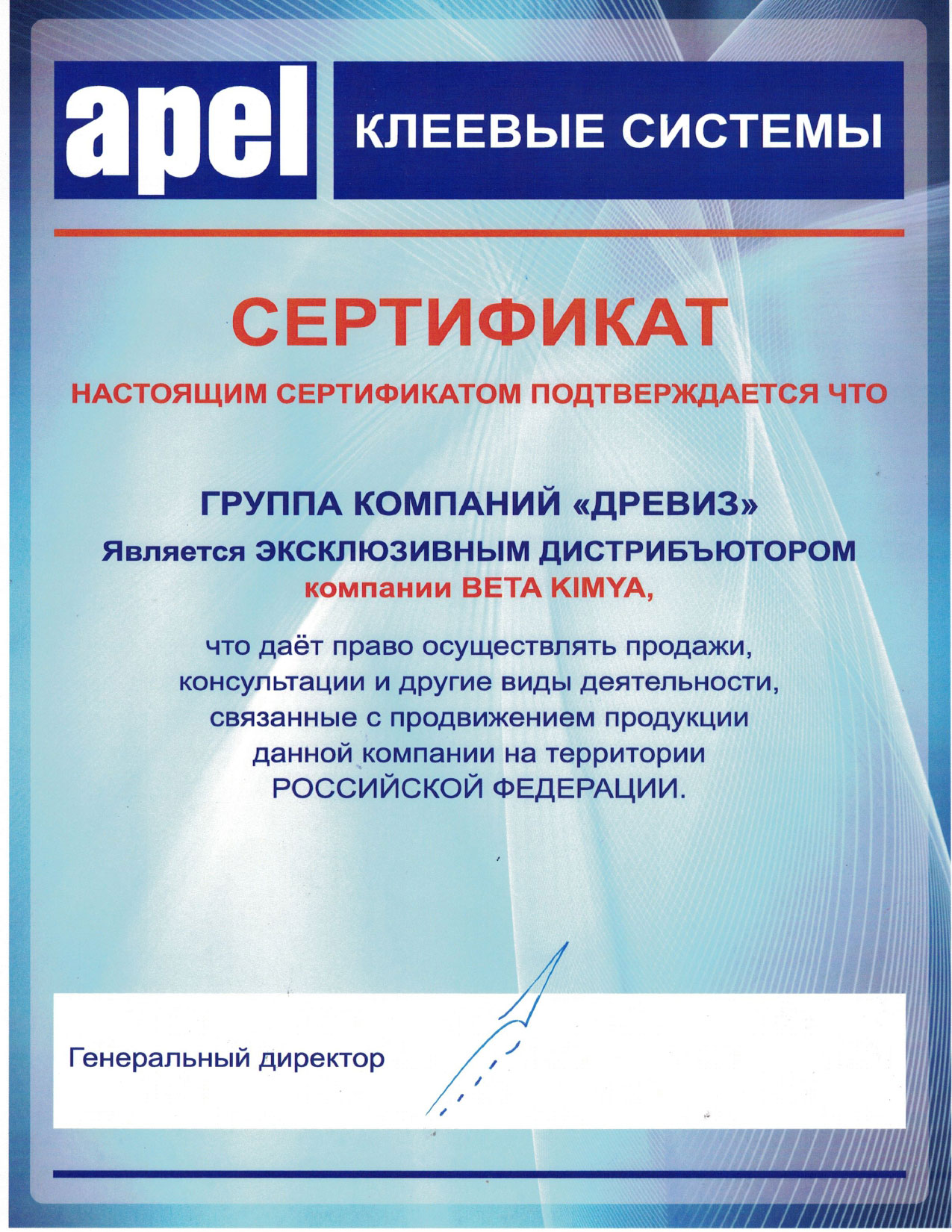 ГК Древиз является официальным и эксклюзивным представителем на территории РФ турецкого производителя клеевых систем APEL (BETA KIMYA)